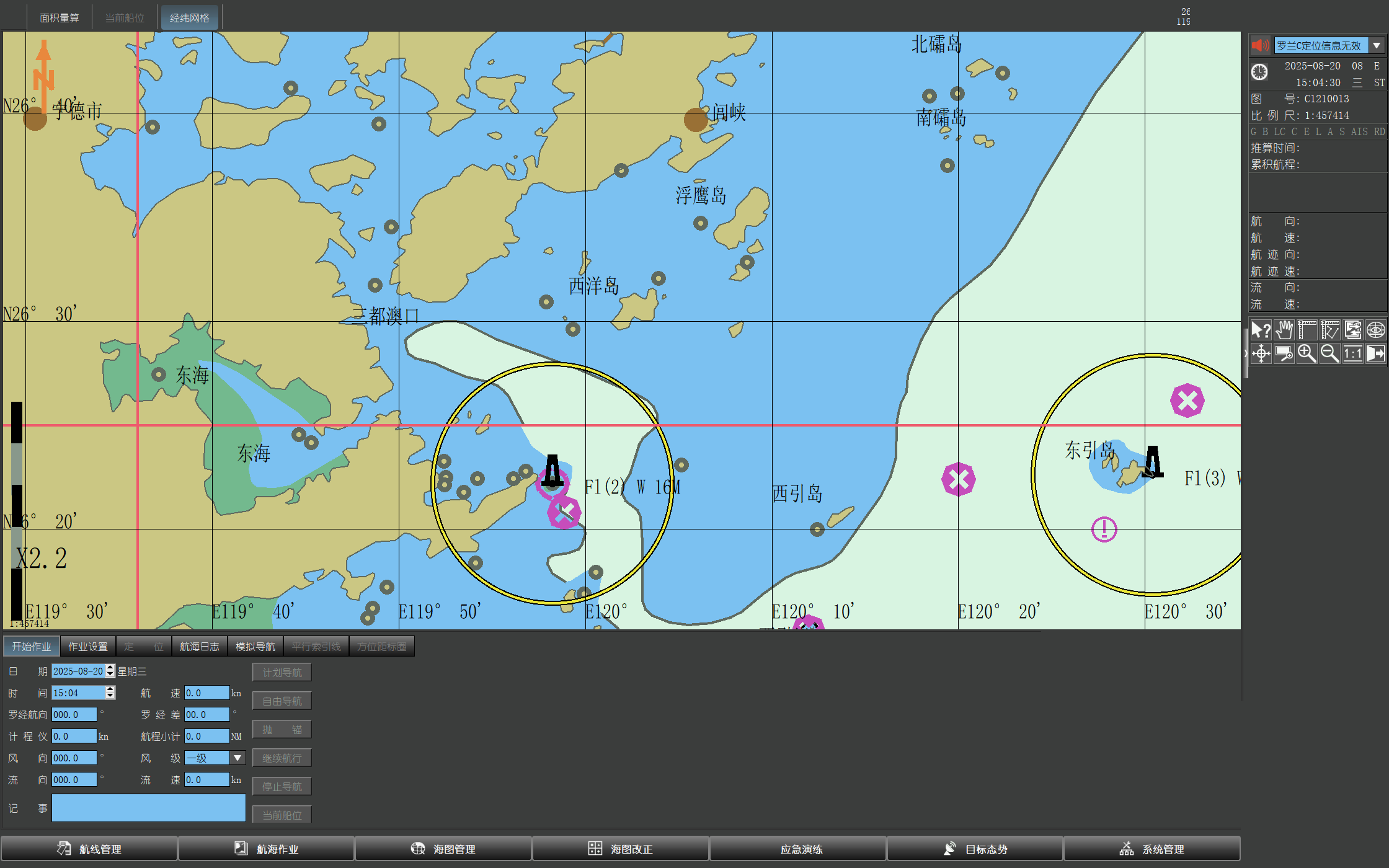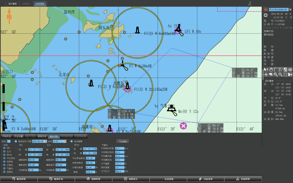電子海圖主要由北斗衛星提供高精度位置信息、速度信息、時間信息,在電子海圖上實時顯示本船位置、航行方向。通過計劃航線的設置,實時計算到達航點的剩余時間、實時計算當前航偏航線的距離,當偏航距離超出限定值時,進行偏航報警。實時計算與監視區域內危險礙航物距離,當超出限定值時進行礙航物報警。